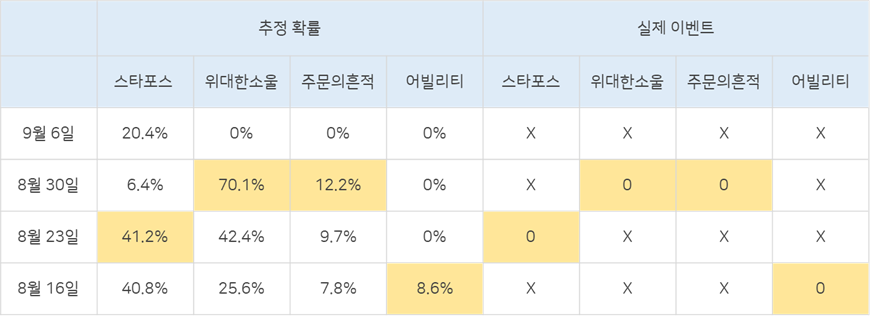 스타포스 등장확률은 단순히 지난 번 일어난 이벤트들의 주기의 영향만 받는다는 가정이다.